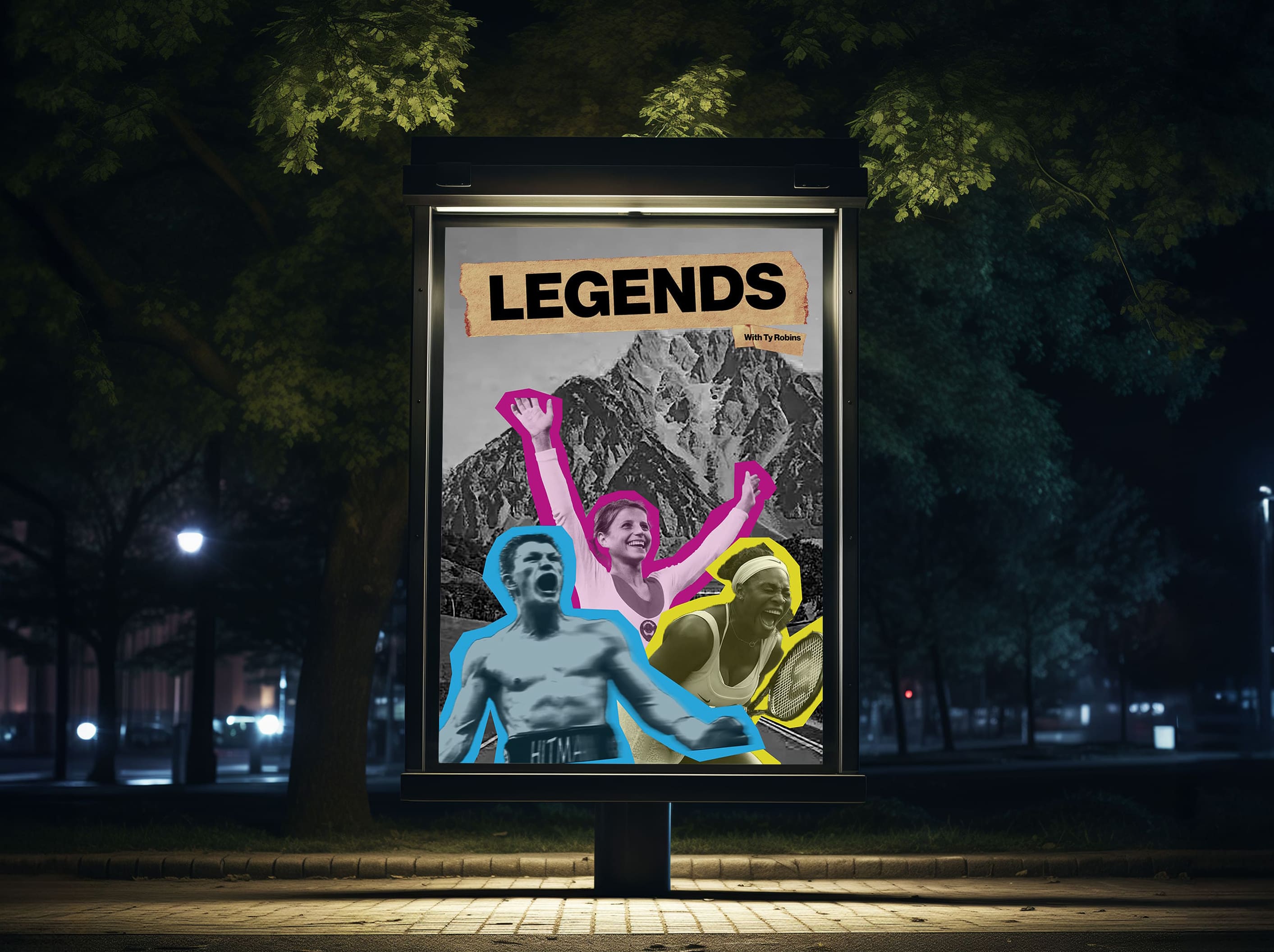 A podcast cover for a new show about the forgotten tales of athletes from around the world. Incorporating the use of AI to create unique imagery, my visual concept was expressive, movement and layered.
